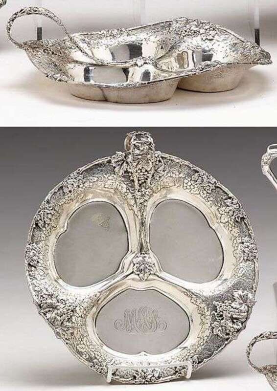 Retailed by J. C. Grogan Co. Pittsburgh, the tri-form with pierced scroll handles and with relief chased and engraved fruiting vine borders.