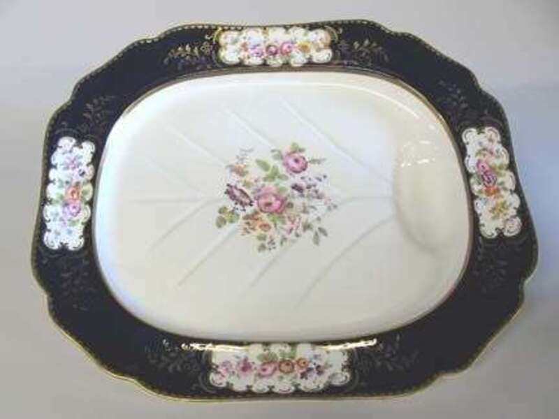 The central floral spray surrounded by a cobalt blue border with floral reserves.