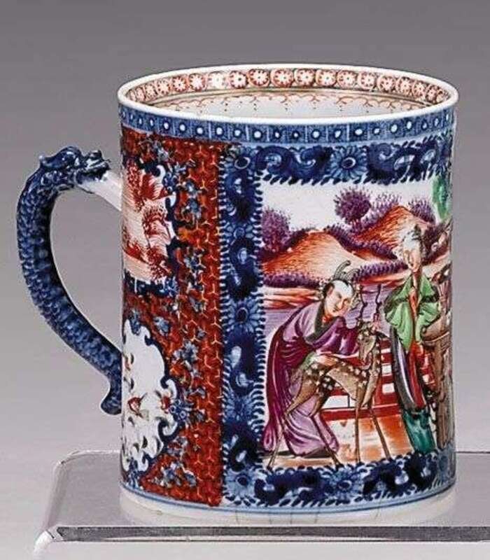 The cylindrical body decorated with figures and a deer in a garden landscape, with dragon-form handle.