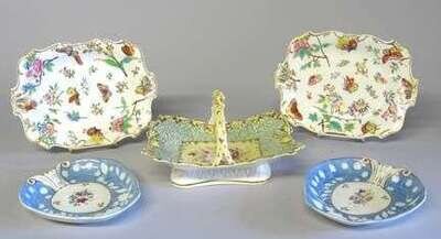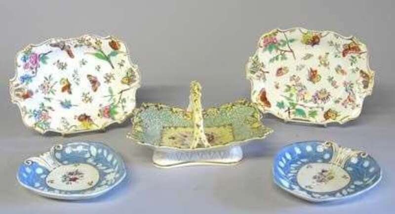 With a central floral reserve surrounded by a gilt scalloped border and a branch form handle; together with a pair of English porcelain serving dishes, with polychrome chinoiserie decoration, 19th century, and a pair English shell form serving dishes, 19th century. (5).