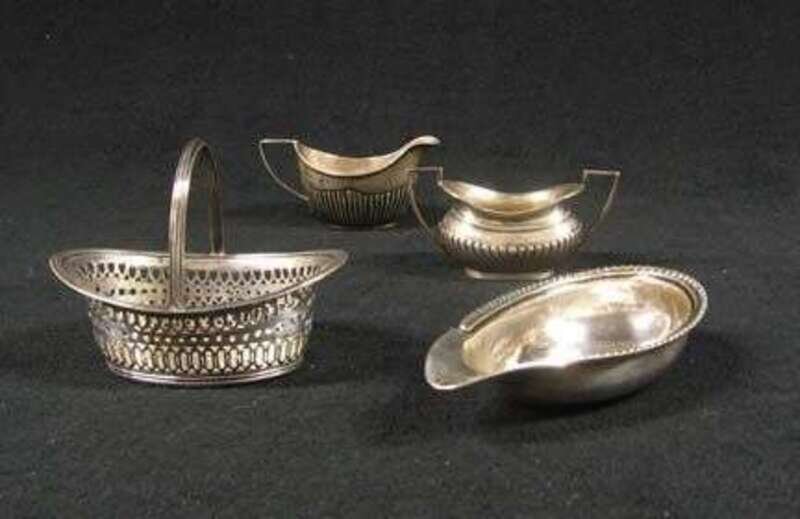 Maker's mark rubbed, of typical form with gadrooned rim; together with an Edwardian sterling silver reticulated sweetmeat, Sheffield 1909, of basket form and a small English sterling silver creamer and sugar bowl. (4).