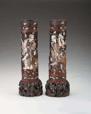 Pair of Japanese carved bamboo, mother-of-pearl and ivory vases 19th century