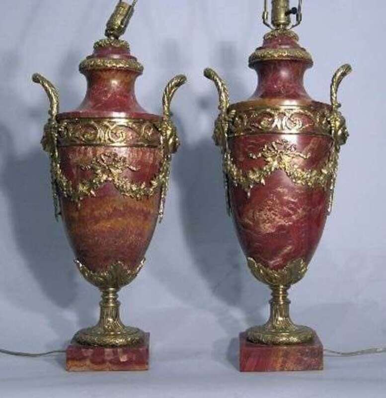 Now fitted as lamps, with twin mask scroll handles, united by ribbon tied floral swags, raised on socle bases.