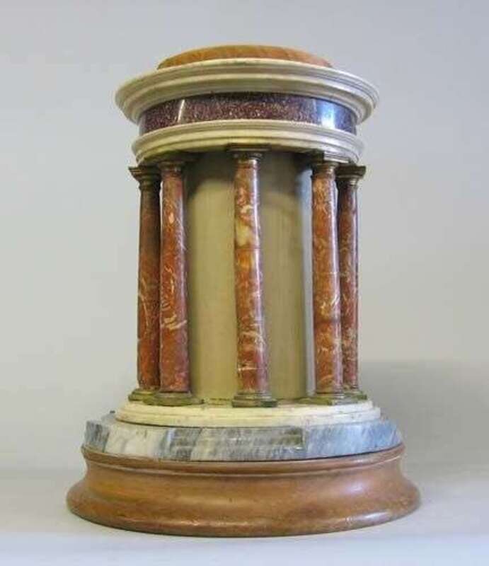 In the form of a circular Roman temple, the rouge marble columns supporting a white marble and porphyry cap, raised on a stepped gray marble and circular wood base.