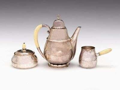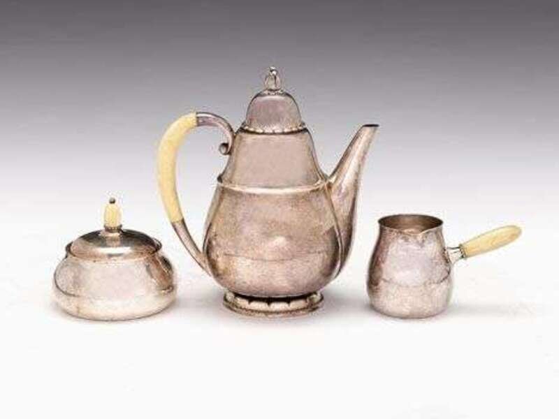 Model number 30A, with an ivory scroll handle and bud finial. H: 7in; together with a Georg Jensen sterling silver covered sugar bowl with ivory finial and a creamer with ivory handle, after 1945, model number 80A. 22 oz. (all in). (3).