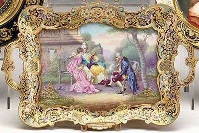 French Sèvres style porcelain and champlevé enamel tray late 19th / early 20th century