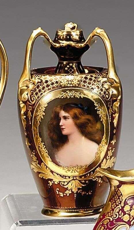 The shaped neck with three scroll handles, the sides painted with a bust length portrait of a young beauty inscribed 'Lassitude', against a red lustre ground enriched with gilt foliage and trellis, red beehive mark.