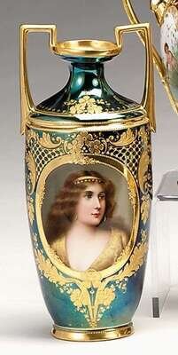 With twin handles, painted with a bust length portrait of a young beauty inscribed 'Preciosa', against a green lustre ground enriched with gilt, red beehive mark.