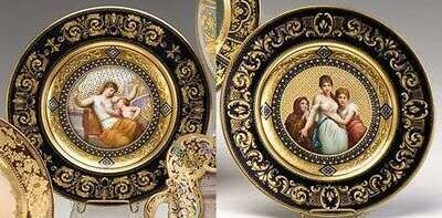 Each with centered by a figural painted medallion, against a cobalt blue ground enriched with gilt.