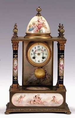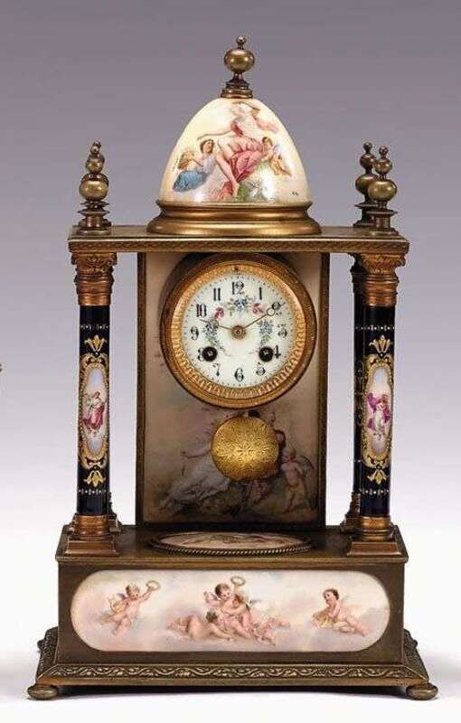 Signed A. Heer, of temple form, the circular dial painted with a floral wreath, surmounted by an arched top painted with classical figures, supported by four cobalt blue Doric form pilasters, raised on a square base inset with painted panels depicting playful cherubs.