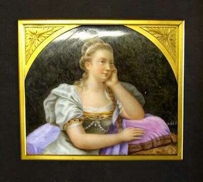 The arched plaque painted with a young beauty, possibly Catherine the Great, dressed in a jeweled gown resting against a pillow, plaque would appear to have originally been rectangular.