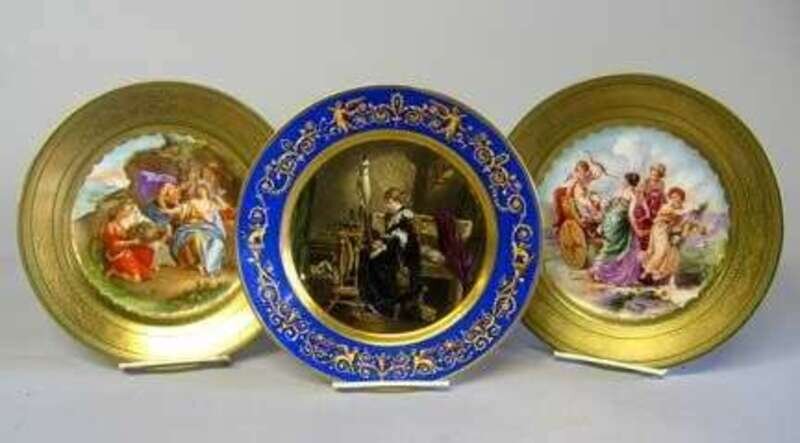 Painted with a scene depicting a young maiden at a spinning wheel with a cat by her feet; together with a pair of Vienna porcalain plates, each printed with a mythological scene, inscribed 'The Triumph of Love' and 'Ariadne on the island of Dia', printed crown marks. (3).