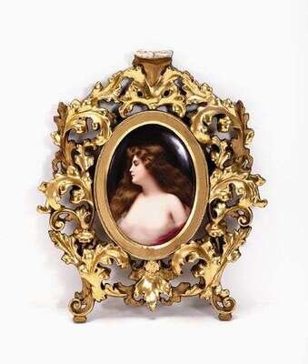 Painted with a young beauty wearing a diaphanous dress with flowing brown hair, impressed KPM and sceptre mark, framed.