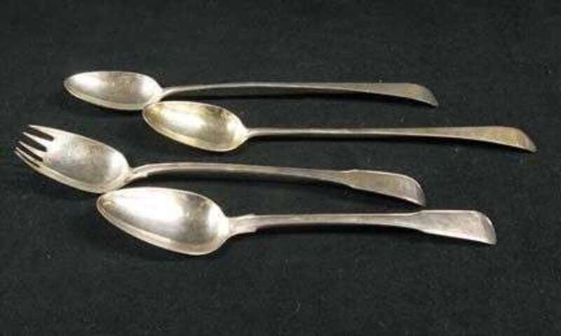 Together with two George III sterling silver fiddle and thread pattern basting spoons, by Peter & William Bateman, London 1789, one converted as a salad fork. 17 oz. (4).