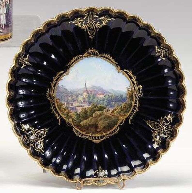 Finely painted with a central reserve depicting a scenic view of Wesenstein, against a cobalt blue ground, enriched with gilt, blue crossed sword mark and entitled in black.