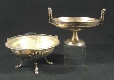 Chased with laurel wreath bands and with twin female mask handles. H: 7, W: 10 1/2 in.; together with a Continental silver bowl, 19th century, raised on four scroll feet surmounted by shell motifs, stamped 800. H: 5, W: 9 1/2 in. 35 oz. all in.
