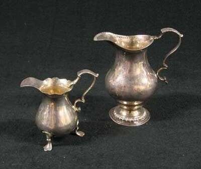 Maker's mark rubbed, of inverted pear shape with a double scroll handle, raised on a gadrooned circular foot. H: 5 1/2 in; together with a smaller George II sterling silver creamer, London 1752. H: 4 in. 8 oz. (2).