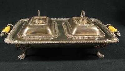 The stand with a gadrooned edge and twin ivorine turned handles, raised on hairy paw feet, inset with two cushion form entree dishes. W: 20 in.