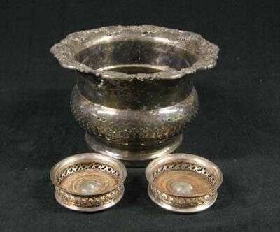 The pierced sides with a flared rim decorated in relief with fruiting vines. H: 5 1/2, Diam: 8 in; together with a pair of Sheffield plate wine glass coasters, 19th century, with turned wood bases. Diam; 3 1/4 in.