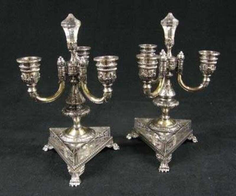 The baluster stems with three outscrolling branches, raised on tri-form bases with paw feet.