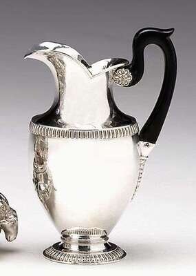 Of baluster form, the sides with an ebonized scroll handle and decorated with gadrooned bands.