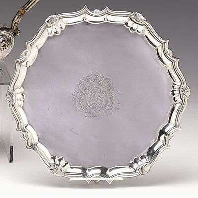 Of shaped circular form with a shell and piecrust molded rim, raised on three scroll feet, monogrammed.