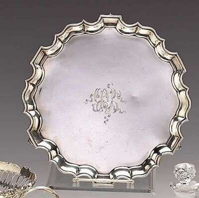 Retailed by Asprey, London, of shaped circular form with a piecrust edge, raised on three leaf cast scroll feet, monogrammed.