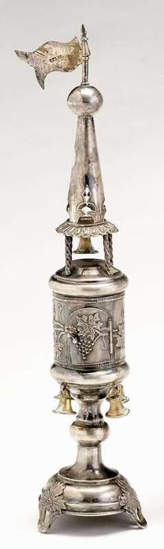 The pierced conical top surmounted by a sphere and flag, over a central cylindrical compartment from which are suspended four bell-form drops, the body raised on a circular tri-pod base with grapevine decoration.