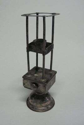 The squared open top supported by four posts from which is suspended a sliding tray, over a squared compartment with single drawer, the whole raised on a domed base, bearing stamped mark 'N' and 'JR'.