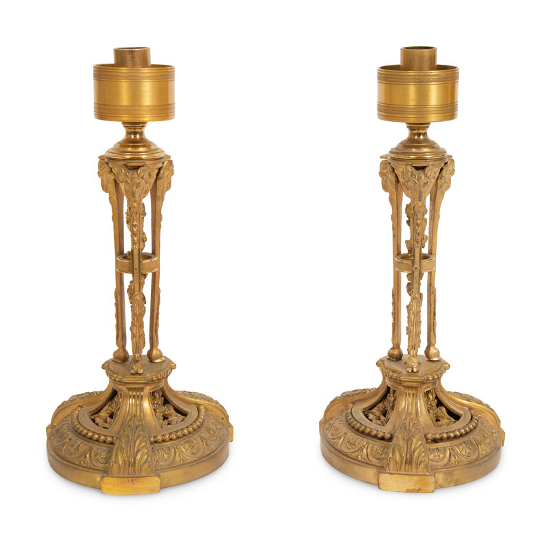 A Pair of French Gilt Bronze Tripartite Candlesticks