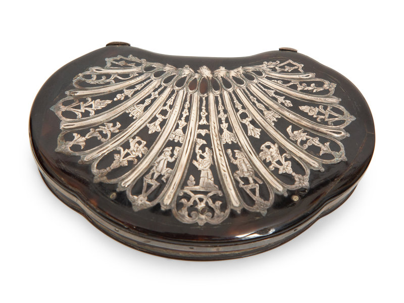 The inlaid snuff box of scalloped form, the cover inlaid with a bacchanal scene, eagles, and flames.