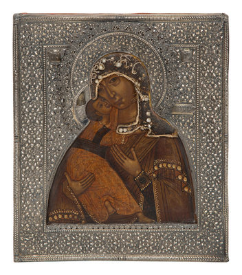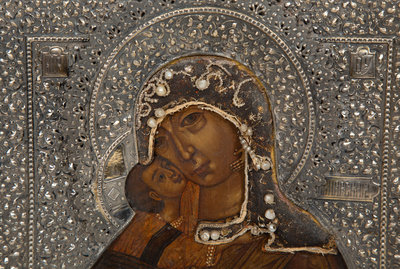 A Russian Silver and Pearl Inset Oklad Icon