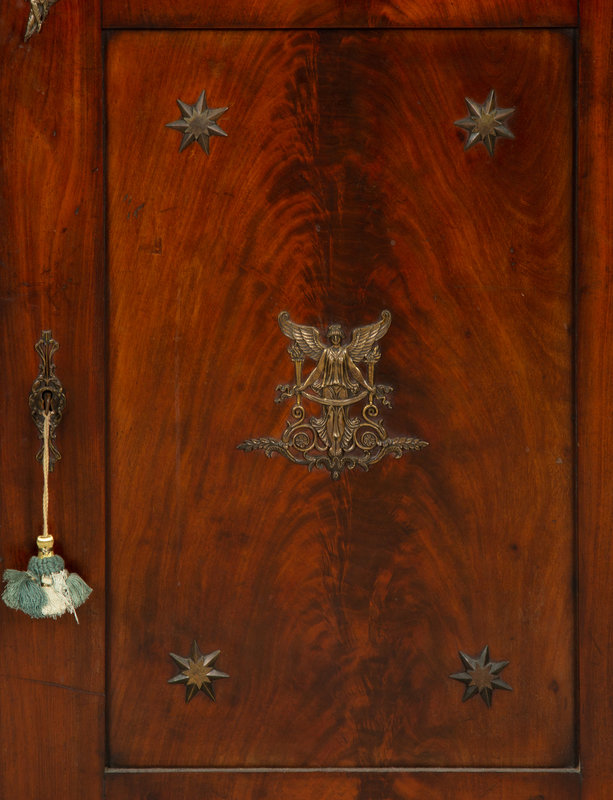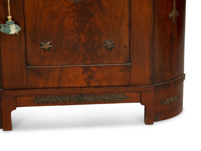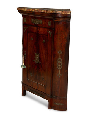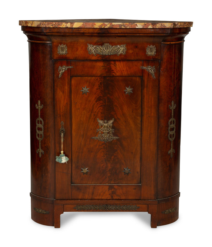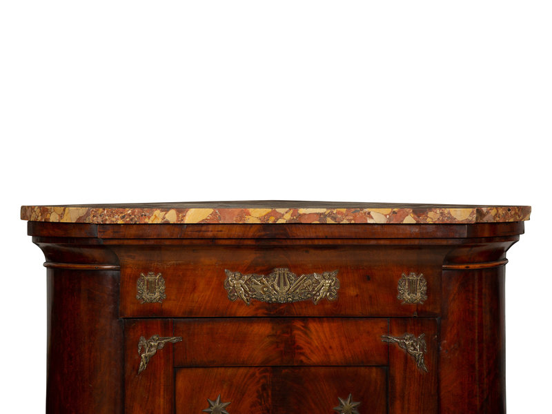 An Empire Gilt Bronze Mounted Mahogany Encoignure with a Brèche d'Alep Marble Top