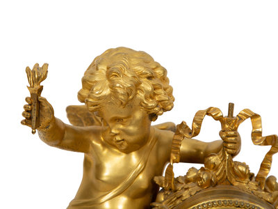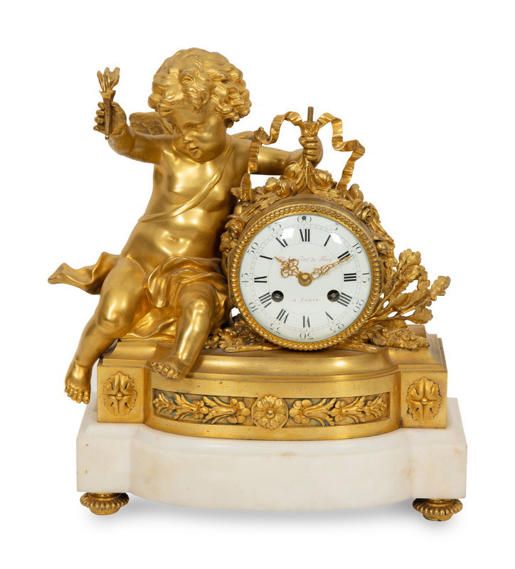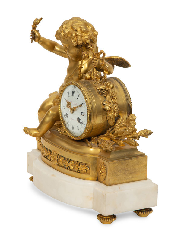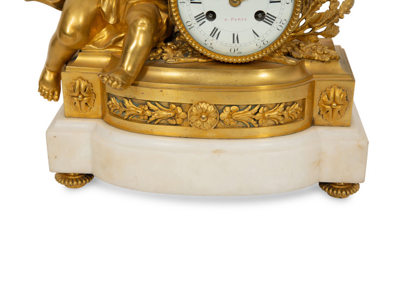 A Louis XVI Style Gilt Bronze and White Marble Mantel Clock