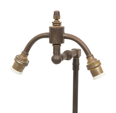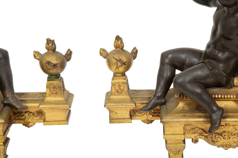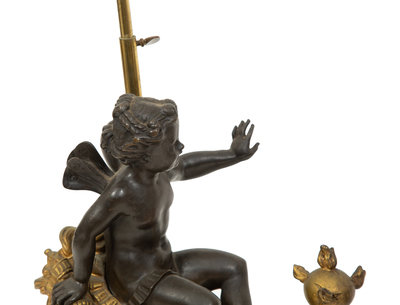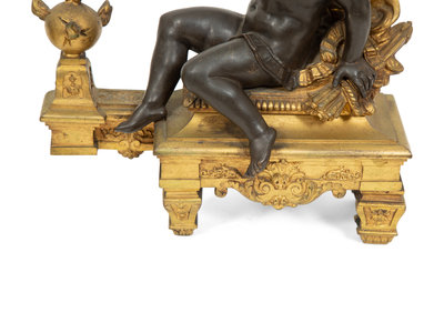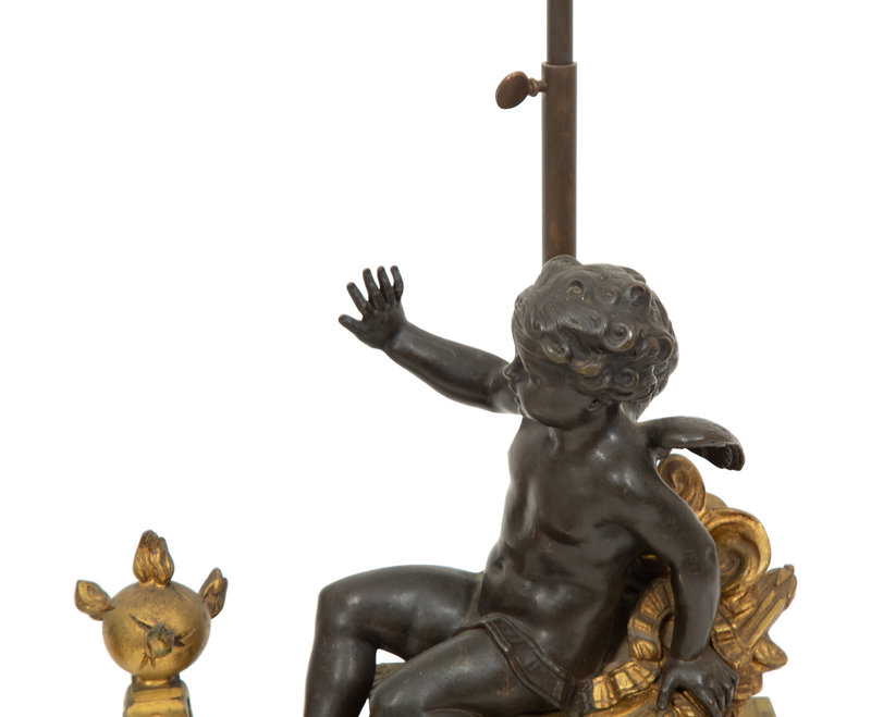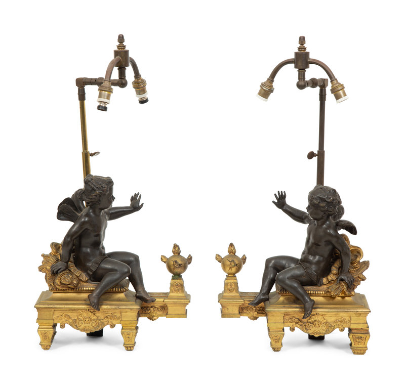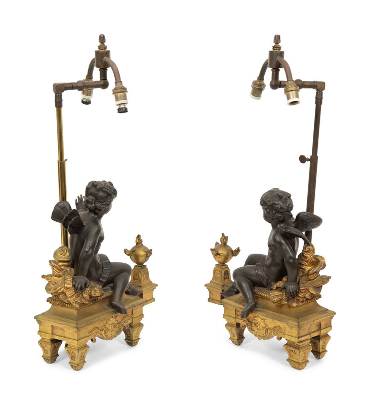 A Pair of French Gilt and Patinated Bronze Figural Chenets Mounted as Lamps
