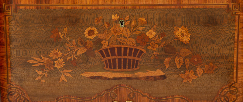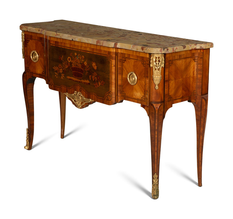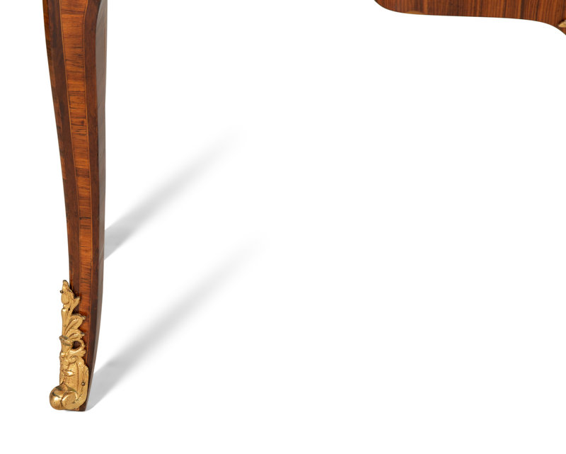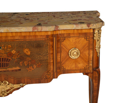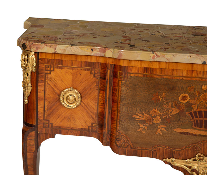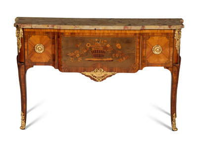 A Louis XV Style Gilt Bronze Mounted Kingwood and Marquetry Marble-Top Commode