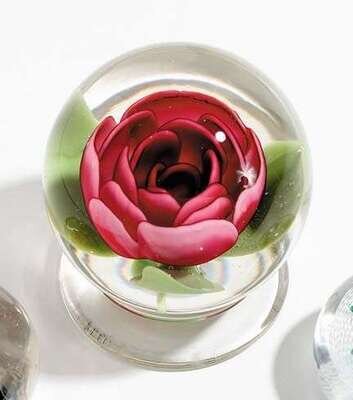 Crimp red rose with classic double petal and opaque yellow green leaves. .