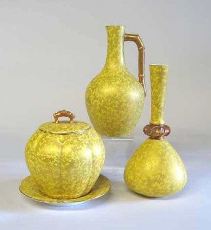 With gilt seaweed decoration throughout against a canary yellow ground; together with a similar Royal Worcester vase and a pitcher. (3).