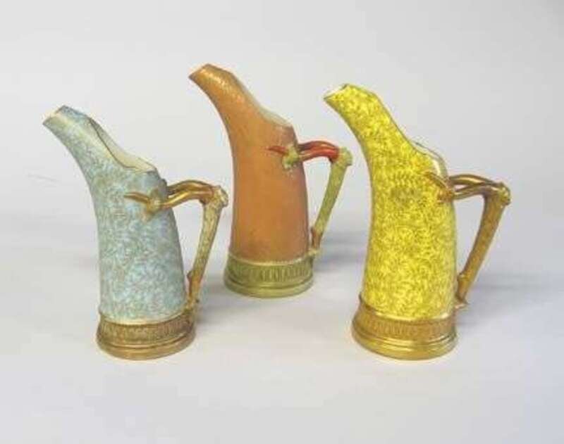Each with naturalistic horn handles and gilt foliate decoration, against pale blue, yellow and burnt orange grounds, printed crown marks.