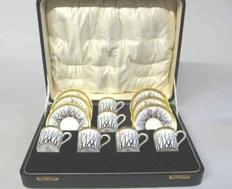 Retailed by the Goldsmith's Co. Cardiff, each decorated with fruiting stylized trees, with acid etched gilt rims, printed puce mark, Made in England.
