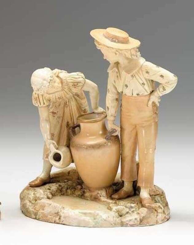 Modeled as a boy and girl carrying an amphora, raised on a naturalistic oval base, printed puce crown mark, impressed Hadley.