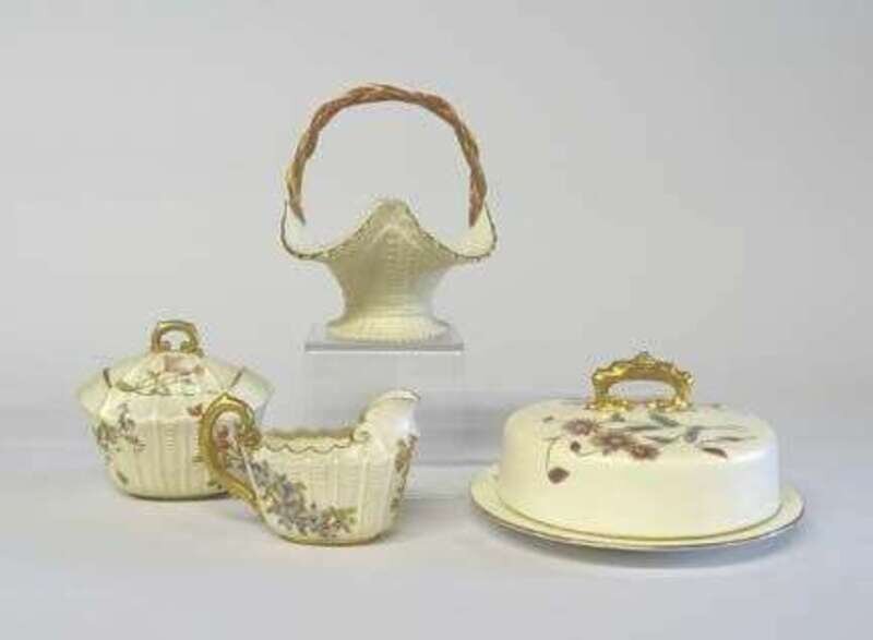 The domed cover with a claw handle and painted with flowers and foliage; together with a Royal Worcester porcelain basket, a creamer and matching covered sugar pot, late 19th century, printed crown marks. (4).