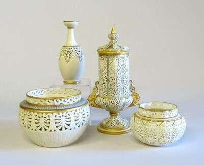 The ornate arabesque pierced and turquoise 'jeweled' lobed sides, surmounted by mask motifs, the ovoid apron with twin scroll handles, raised on a conforming socle base; together with a Grainger's reticulated porcelain vase and two potpourris, one lacking cover, printed shield marks. (4).