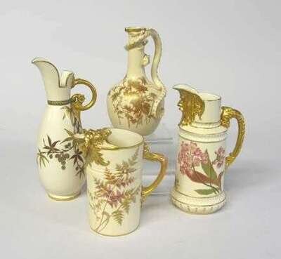 Each with foliate decoration against an ivory ground enriched with gilt, printed crown marks.