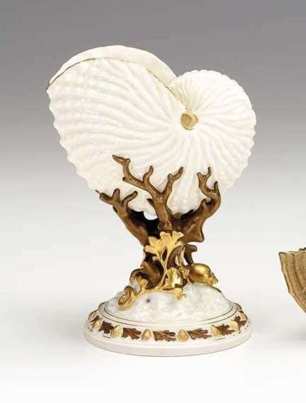 Formed as a conch shell supported by seaweed, the naturalistic circular base applied with further shells, printed green crown mark.