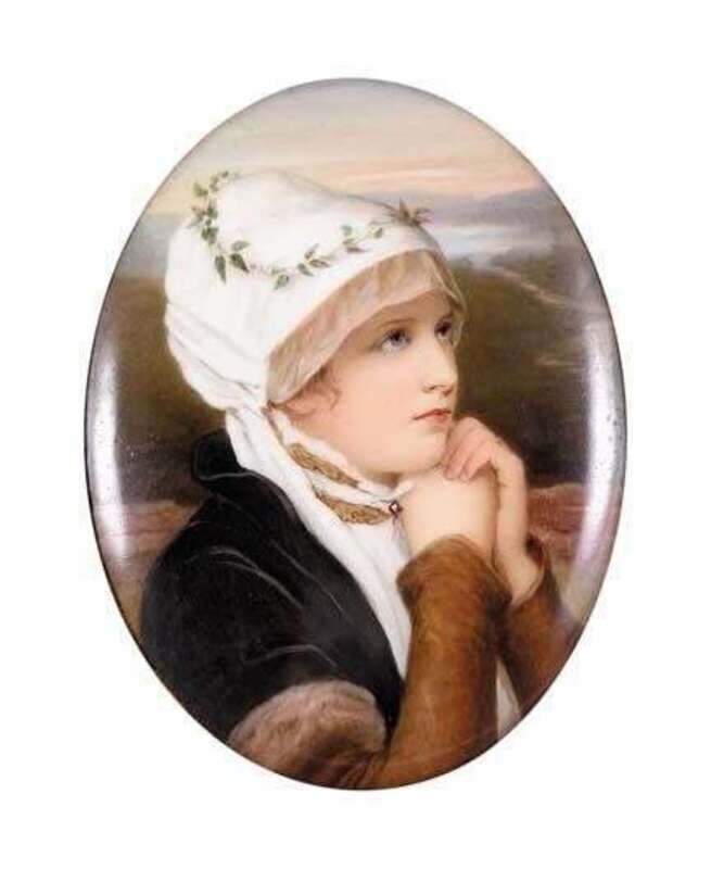 Painted with a bust length portrait of a young maiden wearing a white bonnet and velvet coat with fur cuffs, impressed KPM and sceptre mark, framed.