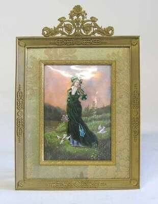 Painted with young maiden wearing a long green velvet gown standing beside a riverbank, in a gilt bronze frame.