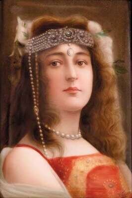 Painted with a bust length portrait of a young beauty, with flowing auburn hair and wearing a jeweled headdress, impressed mark, framed.