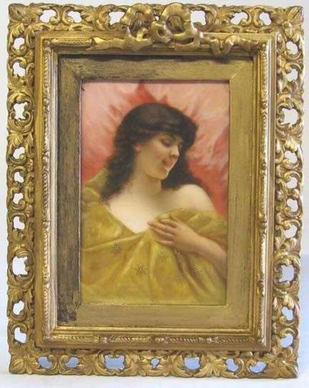 Painted with a bust length portrait of a young beauty, framed.