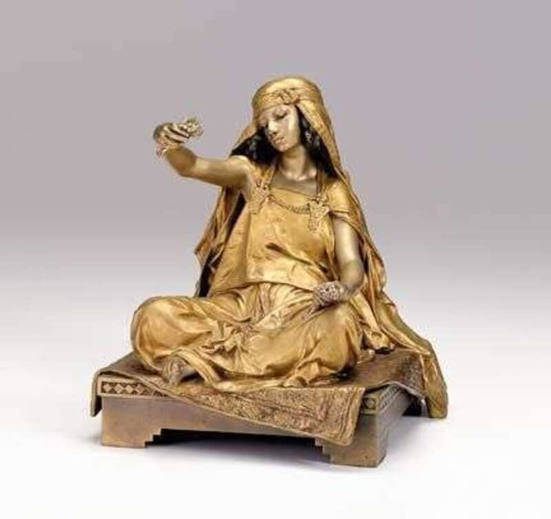 Gilt bronze, modeled as a seated girl, her right arm extended holding flowers in her hand, signed E. Barrias, with Susse Freres Editeurs, Paris, foundry seal and mark. .
